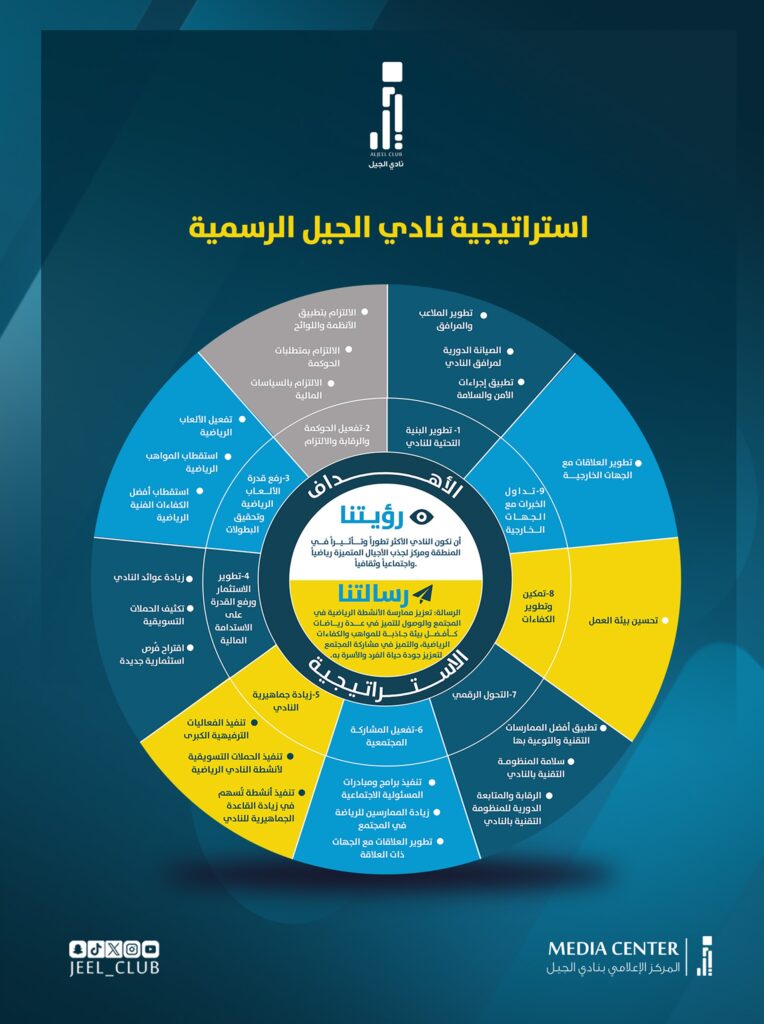 - استنادًا لخطة التطوير الشاملة لنادي الجيل تحت رعاية مجلس الإدارة بقيادة الأستاذ عمر بن مبارك بوعركـة، فإن النادي يعمل بصورة أساسية على إعلاء روح التنافس الرياضي الشريف وذلك بالانخراط في المسابقات الرياضية المحلية والإقليمية والدولية بهدف الفوز وتحقيق أفضل المراكز، كذلك تعزيز ثقافة المسئولية المجتمعية إلى جانب بذل الجهود للمحافظة على استدامة الأصول والموارد للنادي والعمل على تنميتها وتحقيق الاستدامة البيئية والحفاظ على حقوق الأجيال القادمة وغرس ثقافة التنمية المجتمعية.