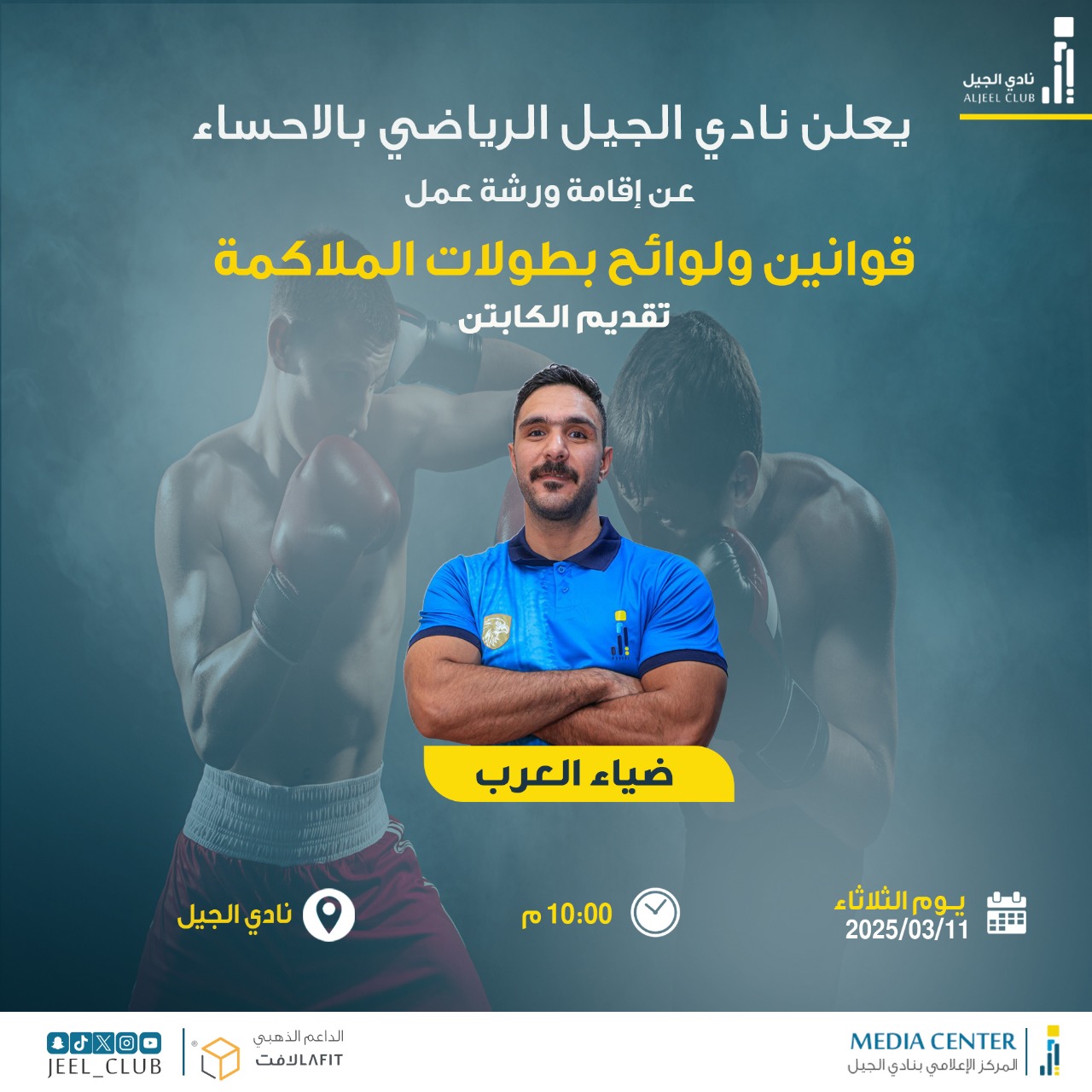 نظّمت إدارة الألعاب المختلفة بنادي الجيل، مساء أمس الثلاثاء، ورشة عمل بعنوان “قوانين ولوائح بطولة الملاكمة”، وذلك ضمن جهودها لتطوير مستوى اللاعبين وزيادة وعيهم باللوائح المنظمة للعبة.