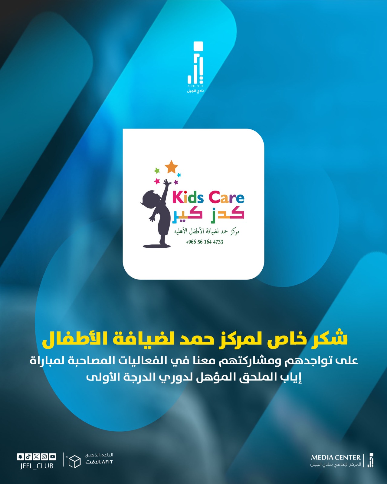 قدّم نادي الجيل الرياضي شكره وتقديره الخاص لمركز حمد لضيافة الأطفال على تواجدهم ومشاركتهم الفاعلة في الفعاليات المصاحبة لمباراة إياب الملحق المؤهل لدوري يلو لأندية الدرجة الأولى، والتي أقيمت على ملعب النادي وسط حضور جماهيري مميز.