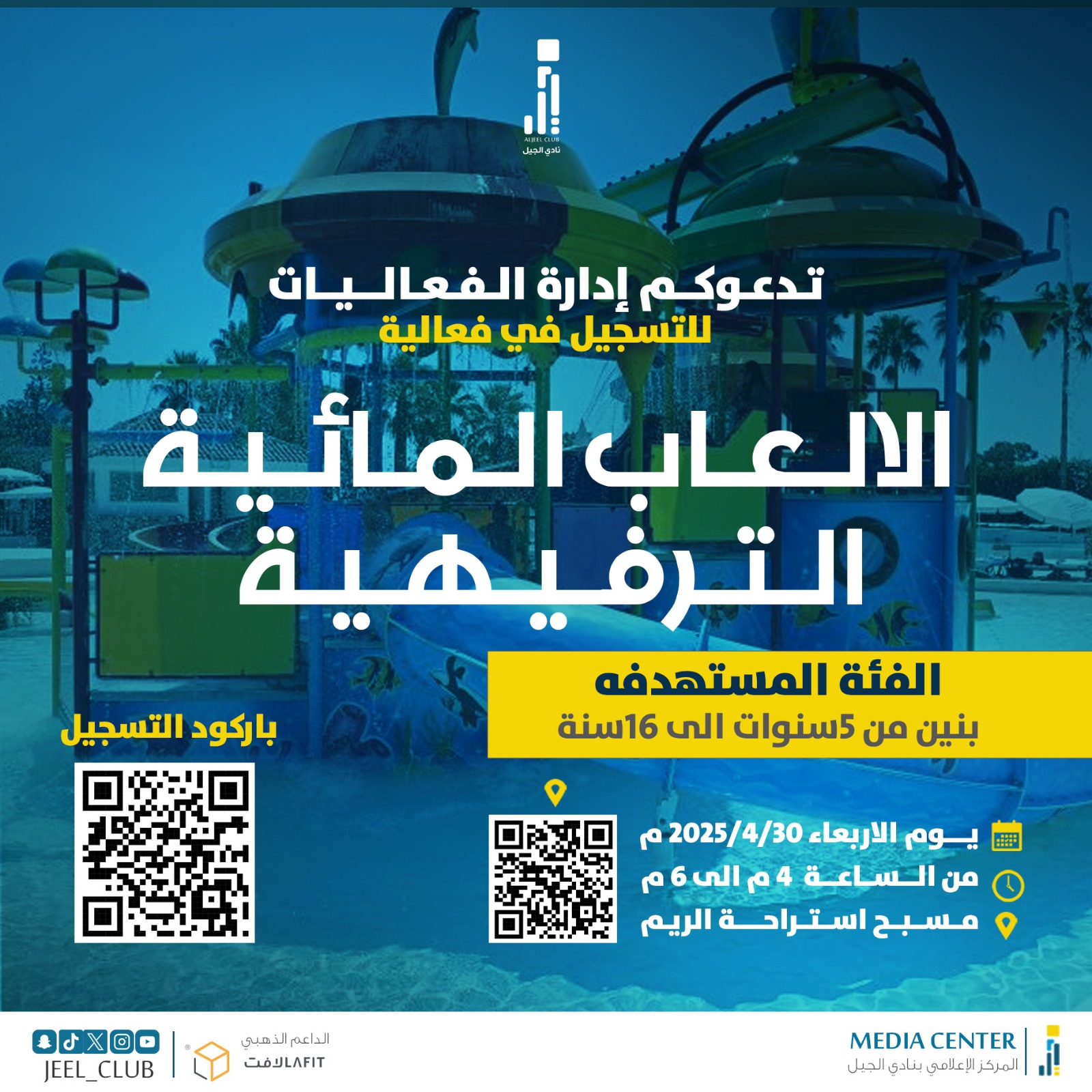 نفذت إدارة الفعاليات بنادي الجيل مساء اليوم الأربعاء 30 أبريل 2025، فعالية الألعاب المائية الترفيهية، وذلك ضمن برامج النادي الاجتماعية والترفيهية الموجهة للأطفال.