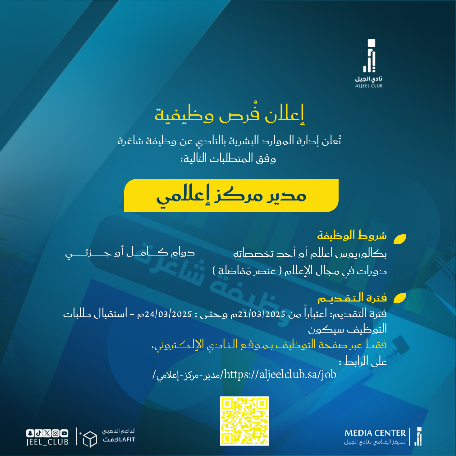 يأتي هذا الإعلان في إطار سعي نادي الجيل إلى استقطاب الكفاءات الإعلامية القادرة على تقديم محتوى احترافي، يعكس تطلعات النادي ويواكب طموحات المرحلة المقبلة.