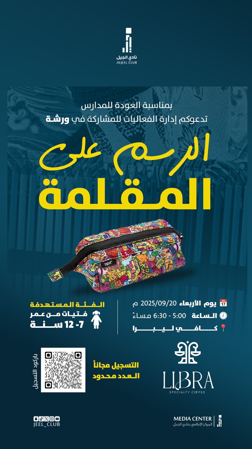 نفذت إدارة الفعاليات بنادي الجيل الرياضي ورشة عمل فنية بعنوان “الرسم على المقلمة”، وذلك مساء اليوم الثلاثاء 20/08/2025م، بالتعاون مع مقهى ليبرا، ضمن برامج النادي المجتمعية التي تهدف إلى تنمية المهارات الإبداعية لدى النشء.