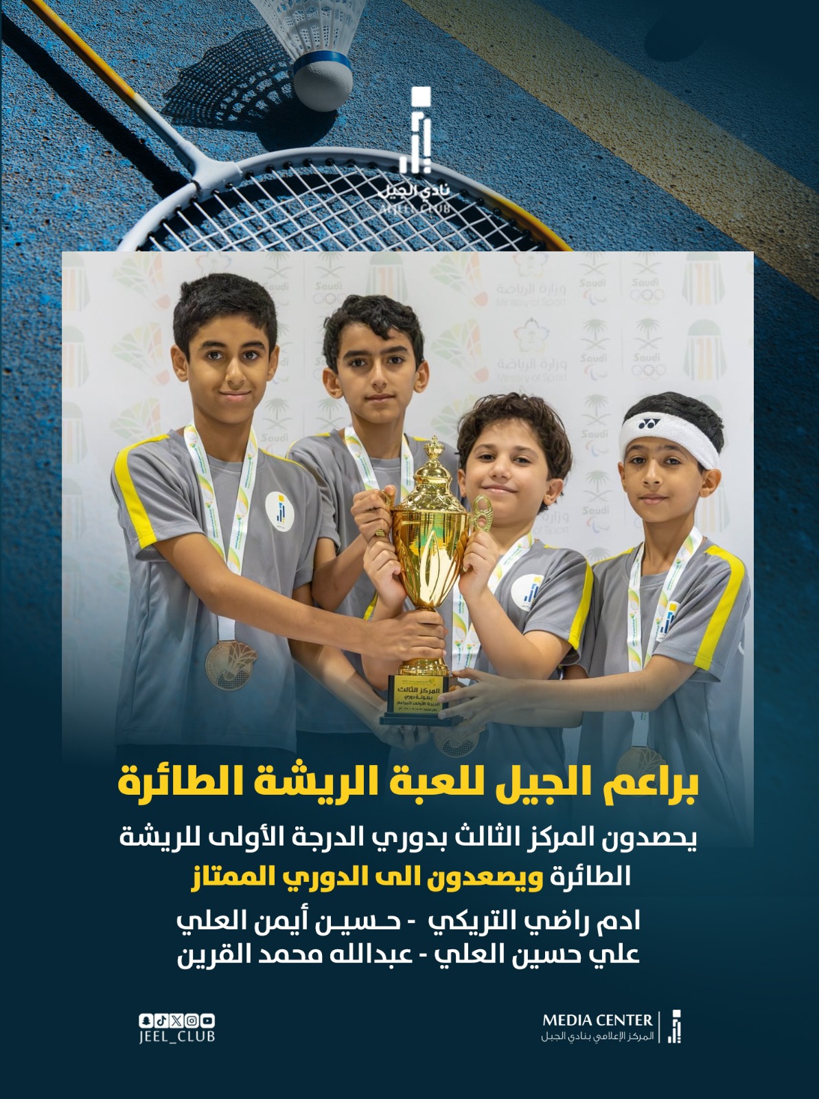 من جانبه، هنأ مدير الألعاب المختلفة بنادي الجيل الأستاذ سامي الراجح اللاعبين على هذا الإنجاز، مشيدًا بما قدموه من أداء مشرف ومنافسة قوية، كما أعرب عن شكره وتقديره لإدارة النادي على الدعم المتواصل الذي أسهم في تحقيق هذا النجاح.
