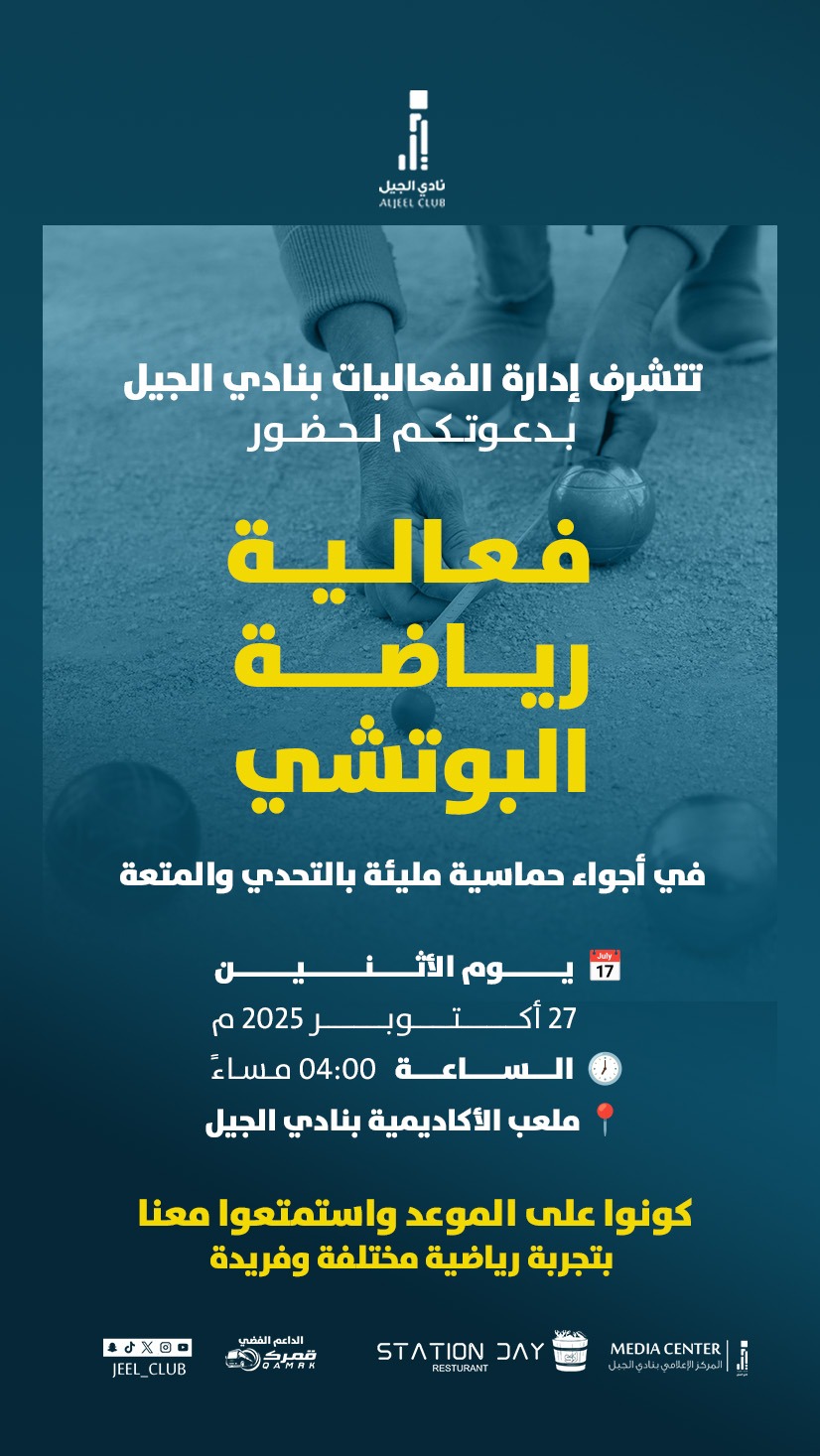 نفذت إدارة الفعاليات بنادي الجيل الرياضي مساء يوم الاثنين 27 أكتوبر 2026م برنامجًا رياضيًا متنوعًا ركز على ممارسة لعبة البوتشي، وذلك بمشاركة جمعية ذوي الإعاقة بالأحساء وجمعية المتقاعدين وعدد من منسوبي النادي.