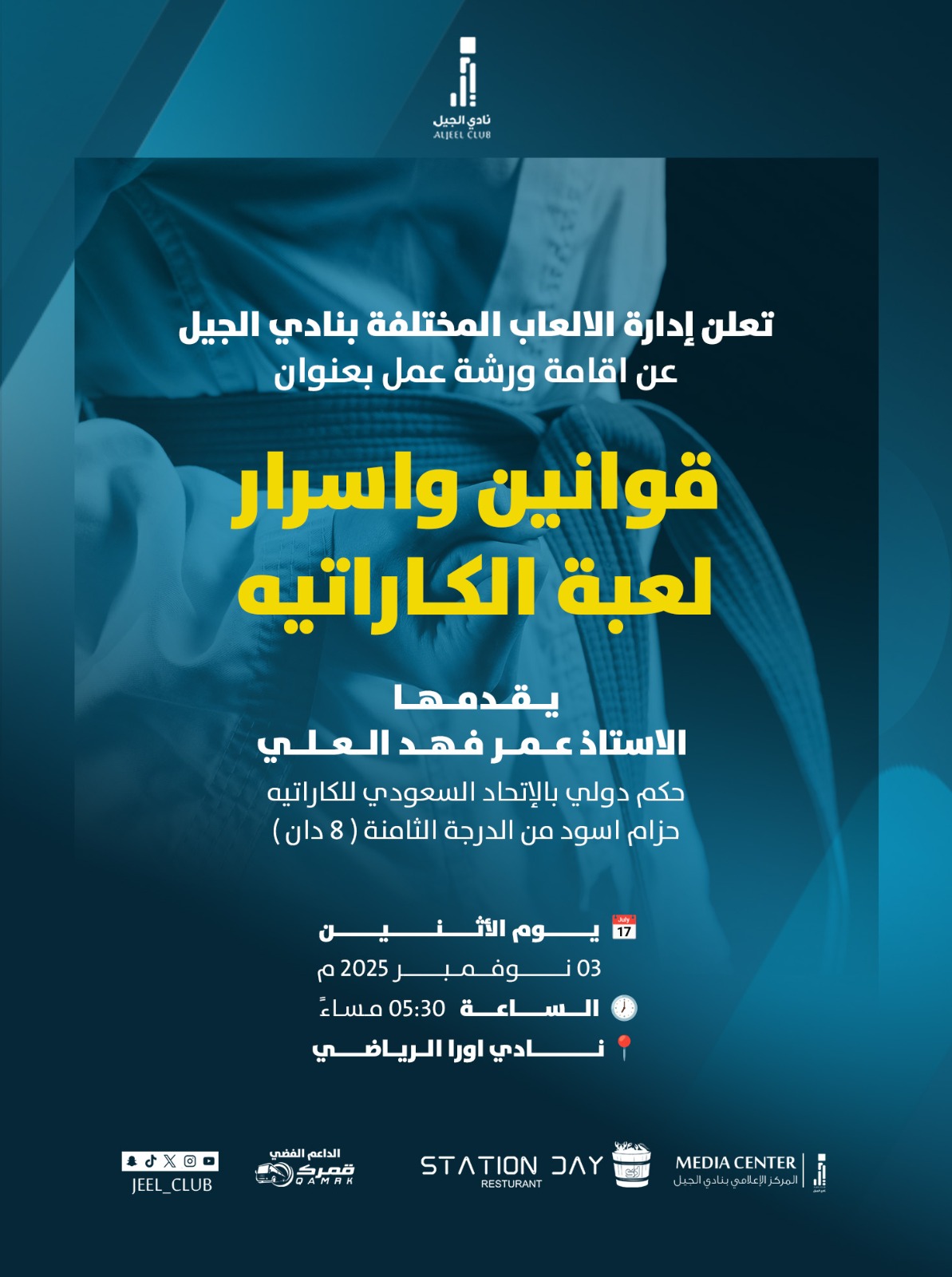 نفذت إدارة الألعاب المختلفة بنادي الجيل الرياضي ورشة عمل بعنوان “قوانين وأسرار لعبة الكاراتيه”، قدمها الأستاذ عمر فهد العلي، الحكم الدولي بالاتحاد السعودي للكاراتيه والحاصل على الحزام الأسود من الدرجة الثامنة (8 دان)، وذلك مساء يوم الاثنين 3 نوفمبر 2025م في مركز أور الرياضي.