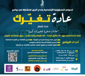 نادي الجيل يطلق برنامج “عادة تغيّرك” لتحفيز المجتمع على القراءة والمشي وتقليل استخدام الأجهزة الذكيةالإدارة9 يوليو، 2025المركز الإعلامي – نادي الجيل أطلقت إدارة المسؤولية الاجتماعية بنادي الجيل الرياضي برنامجها المجتمعي التوعوي “عادة تغيّرك”، وذلك بالتعاون مع ... اقرأ أكثر