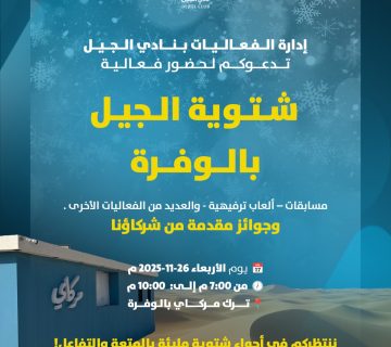 “شتوية الجيل بالوفرة” تجمع المجتمع في أجواء شتوية مميزةالإدارة27 نوفمبر، 2025نفذت إدارة الفعاليات بنادي الجيل مساء يوم الأربعاء 26 نوفمبر 2025م برنامجها المجتمعي “شتوية الجيل بالوفرة”، والذي جاء بهدف مشاركة ... اقرأ أكثر