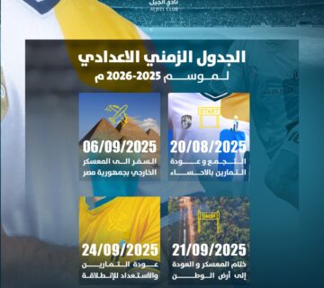 نسور الأحساء تعلن روزنامتها استعداديه للموسم الرياضي 2025-2026مالإدارة5 سبتمبر، 2025المركز الإعلامي – نادي الجيل أعلنت إدارة الفريق الأول بنادي الجيل الرياضي عن الروزنامة التحضيرية للموسم الرياضي 2025-2026م، والتي تتضمن ... اقرأ أكثر