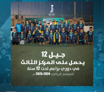 براعم الجيل تحت 12 عامًا يحققون المركز الثالث في الموسم الرياضي 2024-2025مالإدارة23 مايو، 2025الأحساء – المركز الإعلامي بنادي الجيل حقق فريق البراعم لكرة القدم تحت 12 سنة بنادي الجيل المركز الثالث ضمن منافسات ... اقرأ أكثر